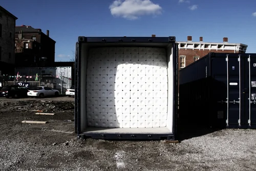 In SALT we occupied a shipping container throughout the 7 week Factory Square Arts Festival. We chose to work with simple salt blocks, pristine white, tapered, and with two different circular holes on top and bottom, as an assembly of units offering numerous formal and material possibilities. Each week authorship in the construction of the spatial installation changed, one new material would be added, opening to the public on Saturday and then inhabited for a shared meal and discussion on Sunday. Each construction became a direct response to the marks of the past iteration, and throughout the salt be-came stained with the soot of flame, the blood of fillet fish, erosion by water, and the seasoning of beets.