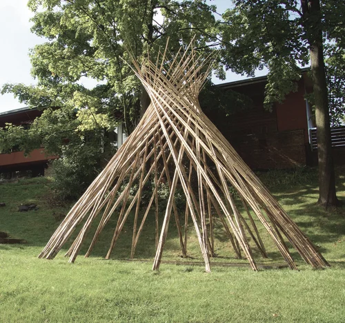 The teepee, located in Bloomfield Hills, Michigan, is the culmination of numerous iterations of line studies examining the capacity of twisted members to simultaneously define space and provide structure. Here, deployed as a backyard pavilion, bamboo members are tethered to an aluminum hoop, providing rigidity and a framed upward view through an open oculus.